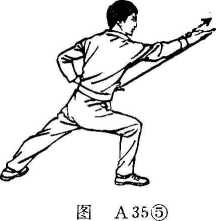 上动不停。上体右转90°,左小臂外旋,由后向上经头左 侧向前直臂伦劈,高与头平,掌心朝上;右掌下落摆至右体后, 拇指一侧朝下。目视左掌(图A35④)。