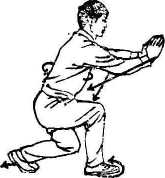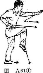 身体重心前移,右腿屈膝提起,脚尖下垂;左腿挺直成 右提膝。同时,左手经右小臂下向前直臂穿出,掌心朝下;右 掌收至腰间,掌心朝上。目视左掌(图A 61①)。上动不停。右脚向前落一步:左脚跟半步脚跟提起,两 腿屈膝下蹲成左跪步。同时,左掌由前屈肘下落。随即两掌向 前,直臂成侧立掌推出,掌心相对,高与胸平。目视两掌(图 A61②)。要点:两掌前推与胸宽,力达掌轮。第二段