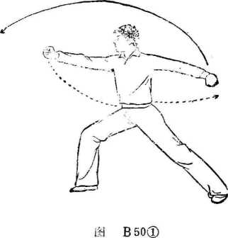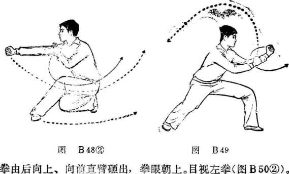 身体重心提起,以两脚为轴向右转体成右弓步。同时, 右拳向上经头前向前直臂劈出,拳眼朝上;左掌变拳向下、向 后摆动,拳眼朝下。目视右拳(图B 50①),②上动不停。右拳继续向下经体右侧向后摆动。同时,左要点:以上三动做时要连贯协调;抡臂时要沉肩,以肩为 轴划立圆;成打虎式时,上体转动要突然,要摆头。