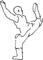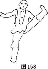 右脚向前垫半步,支撑身体,左腿伸直,左脚向上踢至 右肩上方时,朝左侧外摆。右脚上踢亦同(图158).