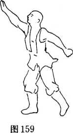 两腿开立成四六步,右腿向后,向上撩击,脚尖绷直,上 体前俯,两手自然摆动(图159、160)。