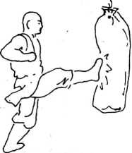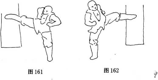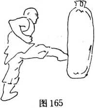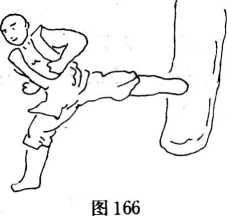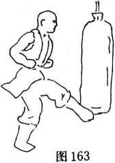 按各种方法如弹踢、前蹬、侧踹、后摆等进行训练(图 163—166)O