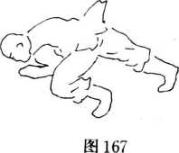 掌停于右肩前,目视前下方,两脚同时蹬地,背脊先着地,身 体曲屈成球状,向前翻转。注意含胸收腹,滚动要快速自然, 连贯协调(图167、168)?
