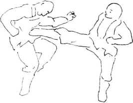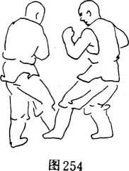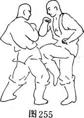 两人面立,对手身体重心前移至左腿。体向右转,左腿 微屈,右脚尖内扣,里脚背用力向前上方弧形勾踢我左脚踝 关节(图254)。我方即将右脚前垫半步,右腿微屈支撑身体, 左腿屈膝上提,脚面绷紧,脚尖下指。膝尖用力向前上撞顶 对手裆部(图255)。