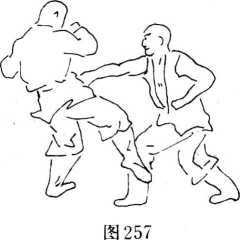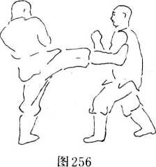 两人面立,对手身体重心前移,左腿微屈,用力支撑身 体。体向左转,右脚面用力向前上、向右横踢我方左肋处。我 方急上左步,右脚跟进成左六四步。上步同时左臂曲屈,肘 关节用力向下挂拨(图256)。接着体向左转,左脚前一步成 左六四步,左臂将对手右腿挂落,右臂内旋,右拳用力向前