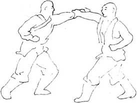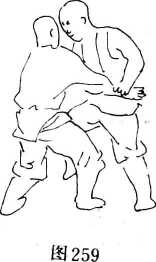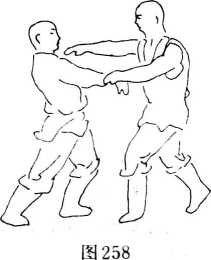两人面立,对手左脚向前一步,左腿屈膝下蹲,右腿跟 进,两脚全掌着地成左高弓步。同时右掌直向我咽喉部击来。 我方体向左转,左手五指向上、向左挡抓对手腕关节脉门,右 臂内旋,右手指尖用力,,猛向前戳插对手咽喉(图258》。对 手会向后仰体化解。我方左手抓其右臂向左下捋拉,右手抓 其胸部猛力回,拉。同时,右腿屈膝上提,膝尖用力向前顶撞 对手裆部或腹部(图259)。