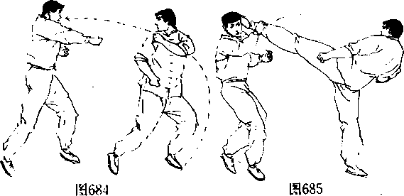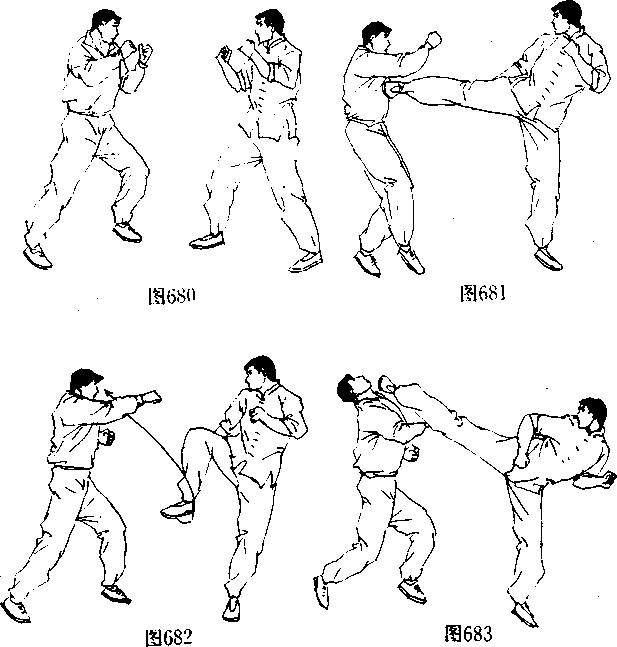 双方呈戒备式(图680),李小龙先用前手虚晃一拳,以分 散对手注意力。接着,抓住战机迅速抬右脚用一记侧踹腿出其 不意的重创对手的胸部或腹部(图681),将其防线彻底打乱, 迫使其暴露出头部空当,然后,右脚略回收(图682),再由屈 到伸继续向上绕过对手的防御之手,猛击其头部(图683),在 对手意料之外得手;最后,在落右脚同时(图684),向左后方 转身,并借助转体、旋身的力量,踢出具有毁灭性力量的左旋 踢腿重创对手头部(图685),将其踢伤或击倒在地。