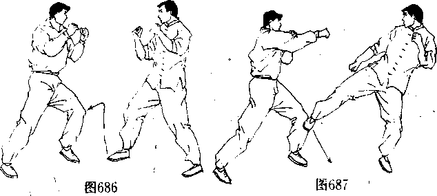 双方呈戒备式(图686),李小龙先用前手虚晃一拳,以吸