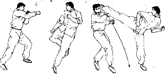 运用本招法时,如对手以猛烈的攻势迅速推进,此时可用 本腿法破之,因为本题法为两胭联动,且在短时间内迅速用前 腿踢击两次,这在紧迫的对击战中甚为有效,尤其是在第一腮 法对手拦截或我方踢空,来不及换腿时,本腿法就会显示出极 大的优越性来,而且最后一脚往往能在对手意料之外得手.另 外,在搏斗中这种连环18击法的攻击性亦特强,成功率很高, 因此它是李小龙在实战中惯用的技击技巧。在连环三脚中,第 一腿的攻击是至关重要的,如打击得力,能使对手很快却步, 并为以后的第二、第三腿攻击创造有利的条件。但需使动作连 贯、突然而迅速,才会有效的攻击对手,并且要一腿比一腿快. 李小龙对本胭法的要求是,要尽量以不转体击中或击倒对手 为目的,这在初级实战技巧娴熟的基础上是不难完成的.