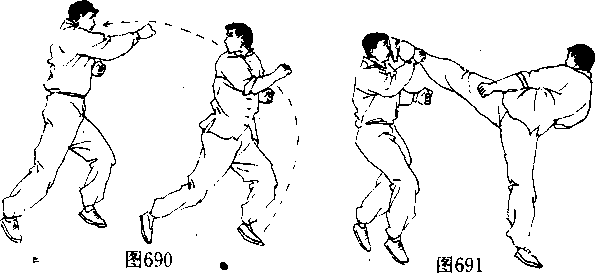 ? 421 ? 引对手注意力,紧接着,抓住时机迅速抬起前脚,且以一记迅 猛的低踢腿攻击对手的膝关节,迫使其暴露出头部空当(图 687);然后,右脚略回收(图688),再由屈到伸继续向上绕过 对手的防御之手用扫踢重创其头面部(图689),最后,李小龙 在落右脚同时(图690),向左后方迅速转身,并借助转体、旋 身的力量,踢出具有摧毁性力量的左旋踢腿猛击对手上盘(图 691),在对手意料之外得手。