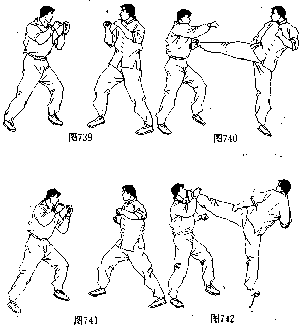 双方呈戒备式(图739),当对付由中跑离冲过来的对手 时,李小龙迅速靠近对手,并在贴近的同时便迅速起右脚进行 便踢戴击(图740);随后,顺势落右脚为轴(图741),再用一记 凶猛的左扫踢魄重击对手头部(图742),攻其措手不及;最