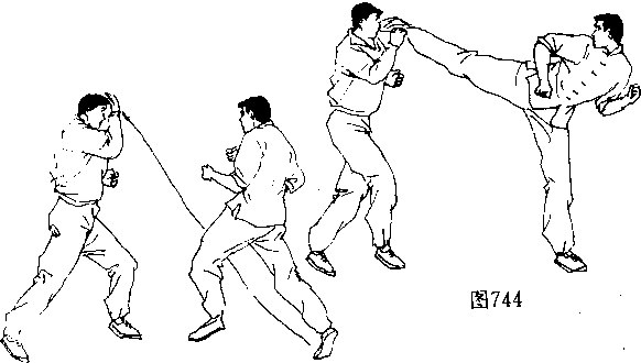 后,在落下左脚的同时(图743),向左前方迅速转体,并借助 转体、旋身的力量,踢出具有毁灭性力量的右扫踢腿重创对手 的头颈部(图744),将其踢昏或重重击倒走地。
