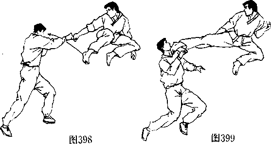 双方由戒备式开始(图 395),我先用前手虚晃一拳, 分散对手注意力;接着,迅速 抬起右脚用一记强劲有力的 右侧踹腿重击对手的中盘(图 396),随后,右脚稍点地,双脚 同时用力蹬地(图397)腾空 跃起(图398),在半空中用右 侧踹腿重创对手的头、面部 (图399),攻其以措手不及。
