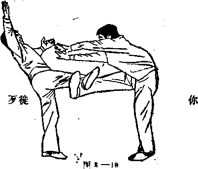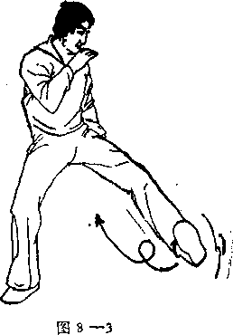 。防对方用弹腿进攻裆部。略同用勾踢踢 对方小腿。上体右转,同时左腿由后经前向右前方弧形勾 踢,高度在膝关节以下,脚内扣上勾,踢后迅速回收成提膝护 裆。右掌放于下颌左侧,左臂弯曲大于90度。手心向内,放 于身体左侧,目视前下方(图8 — 3) o圈腿圆滑,要有勾 劲。踢右腿叫右圈腿,踢左腿叫左圈腿。