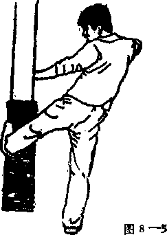 2 .树上缠上草绳,脚带上护踝,用勾踢踢树,高度在 膝关节以下。每天数百忿次(图8 — 5)。