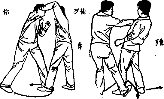 如敌左脚蝙,用左手来抓你头发时,你头向囱身的右 侧潜伏躲开来手,同时向右侧上半步,然居用右勾踢敌左 脚外侧,右手由左向右横击敌胸,敌必倒。