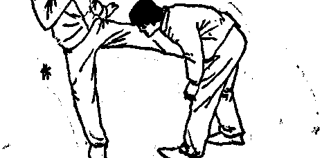 4 .甲手持木棍,顶端包上海棉,由下向上撩乙裆部, 乙用圈腿勾开来木棍,腿不落地踹击甲。