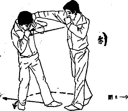 你与歹徒相遇,你用拳猛出歹徒面部,同时大声呼城, 歹徒被迫慌忙防上,同时后退,此时歹徒的下盘空当较明显 的暴露出来。你趁歹徒慌乱时,用勾踢快速攻击歹彼岛右脚 后跟内傅,同时双手猛推歹徒胸部(图8—9、10),力*不