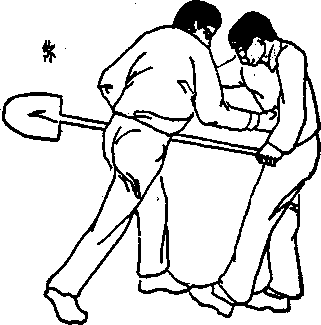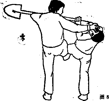 例1:歹徒用铁锹横扫你腰部时,你向前进步左手抓住 锹把,右拳击歹徒腹部。此时,距离歹徒较近,是使用勾踢的
