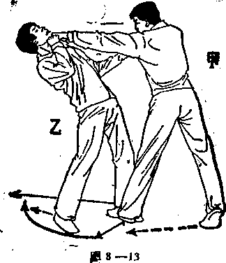 时进步调整角度和距离,用左勾踢踢乙方右脚侧后方,能使其 倒地或失去重心。(图8 —13、14)。.一