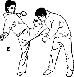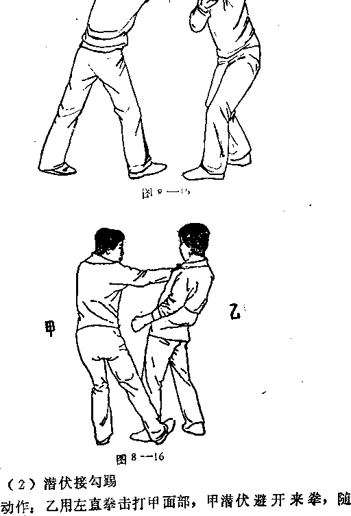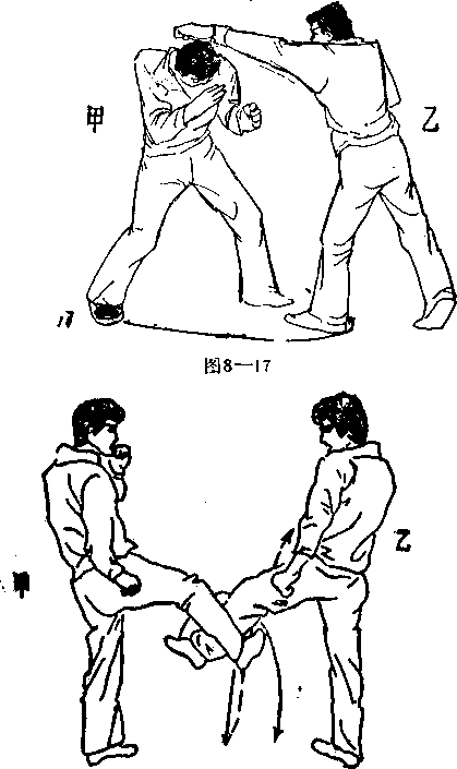 动作:甲上右步用右直拳击打乙面部,乙用左手上架来 拳,甲左脚向前上步用右勾踢攻击,乙左脚跟外侧,同时右手 横击乙胸部(图8—15、16)。要点'动作连贯,勾踢脆快。 八用途,将其摔倒。? ■ n ■之,用右勾踢攻击乙左腿,乙提膝逃脱,甲迅速用右摆腿攻 击乙肋部(图8 —17、18、19),图 8—18要点:潜伏及时,连环腿法要快而有力。用途:攻击其下、中盘。