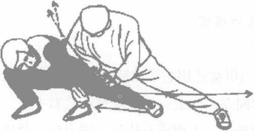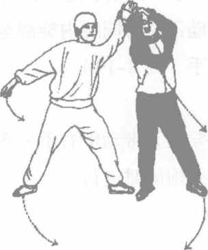 甲起身将乙右臂上提之时,乙应随势手臂放松切莫硬顶住而有碍对练动作的进行。