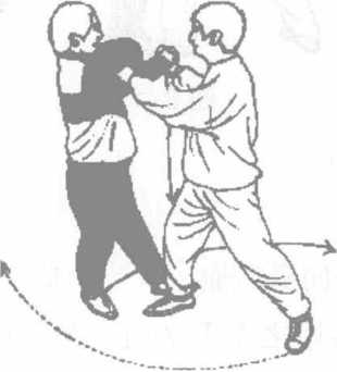 乙在甲转体拿腕时随势左腿向前上一大步以右前脚掌为轴也向右转体180。面向正东方向右臂松开自然下垂(图8-16)。