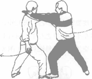承上势当乙用上法时甲左脚收回半步身体直起左脚虚点地面随用左肘反压乙右肘右手拿住乙之右手指向上提拿