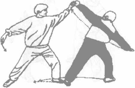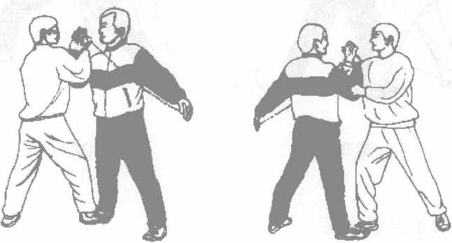 承上势当甲使提臂法时乙右脚尖外展随势站起重心右移成右弓步用左手拿住甲之左手用右手拿住甲之右手并将甲两臂左上右下交叉缠卷目视对方(图8-15)。