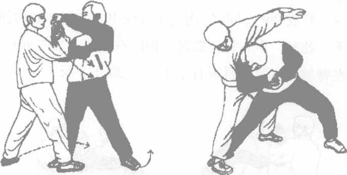 2甲左腿稍向左后撤步身体左转将乙右手带至怀中拿其小指向上、向外翻拧同时右肘压乙右前臂即可击败对方,目视左手此时乙顺势左腿从甲右腿外侧向前上一步,体向右转,