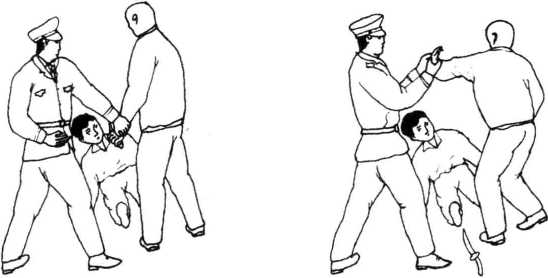 点穴法暴徒拦路抢截将人推倒又拿出短刀行凶时我立即向前用左手扣握住暴徒持短刀的左手外侧,拇指掐住其中渚穴(图3-85)。我左手向上、向左翻拧将暴徒制住短刀掉落,我右手抓住其左手(图3-86),两手同时擒拿暴徒左手,迫使其上体前俯被拿腕掐穴制住(图3-87)。
