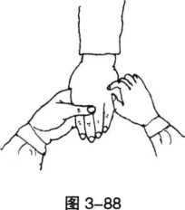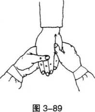 2 按摩解穴法医者将气运到右手拇指拇指按在中渚穴上沿经络先上后下反复按推6-9分钟(图3-89)