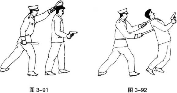 点穴法暴徒右手持枪面向前方时我右手持警棍,左手拿皮带手握皮带两端从后向暴徒靠近(图3-90)我右脚向前上步,左手向前上方摆起用皮带套住暴徒(图3-91)。上动不停,左手回拉同时右手持警棍向前伸出用棍尖端点击暴徒至阳穴(图3-92)