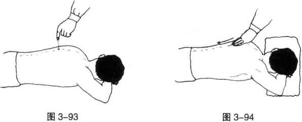 2 按摩解穴法医者将气运到左手食指、中指、无名指和小指四指按在穴位处中指按在穴位上沿督脉向下反复按推6-9分钟(图3-94)。