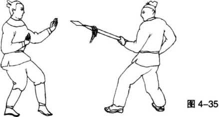 点穴法对方双手握枪企图向我进攻时我成左防备姿势站立(图4-35)。当对方用枪向我身体上部攻击时我左脚向右上方