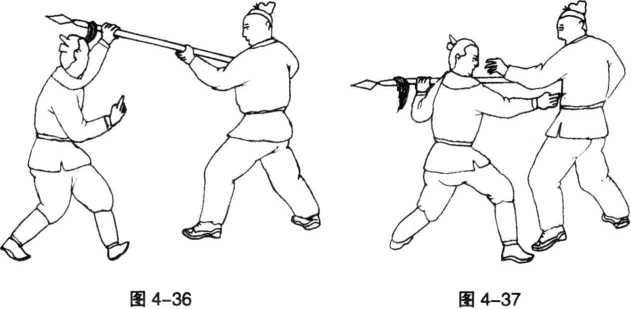稍进步脚尖外展同时左手向左上方抓枪杆前段(图4-36)随即我右脚迅速上步屈膝半蹲成右弓步,右手向前伸出用食指尖端点击对方左大横穴(图4-37)。