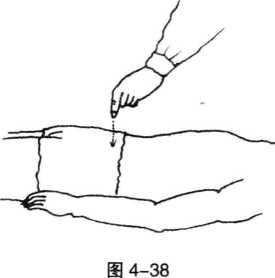 1 发气解穴法伤者仰卧医者站于其右侧将气运到左手食指,食指尖对准穴位发气6-9分钟(图4-38)。