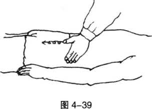2 按摩解穴法医者将气运到左手拇指,拇指按在穴位上沿经络向下反复推揉6?9分钟(图4-39)。