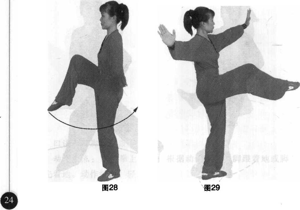 (6) 旋转步:前腿屈膝提 起,后腿支撑以脚前掌为轴向左 摆转180度。(图28、图29)
