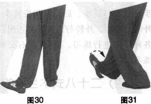 ② 外撇:以右脚跟 为轴,脚尖外撇30~90 度着地。(图31)