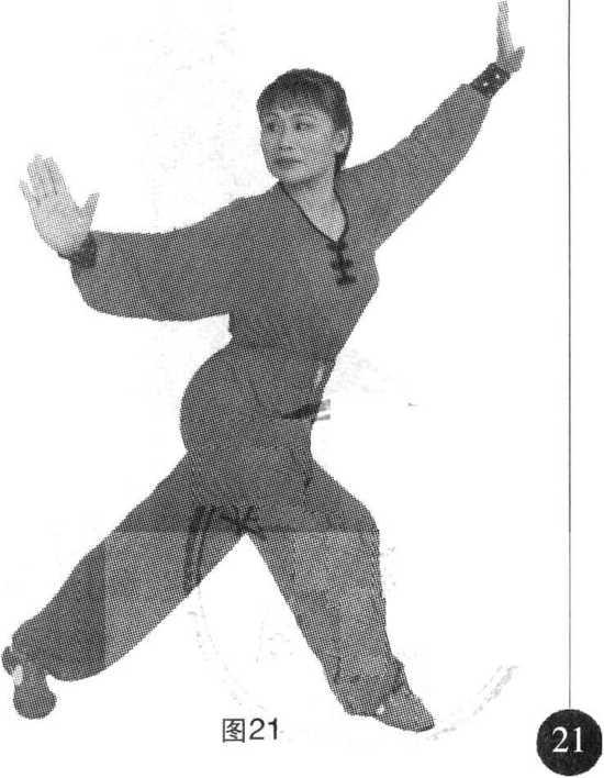 (7) 叉步:两腿交叉, 前脚脚尖外撇45度,全脚掌着 地,屈膝半蹲;后脚前掌着 地,腿自然伸直。(图21)