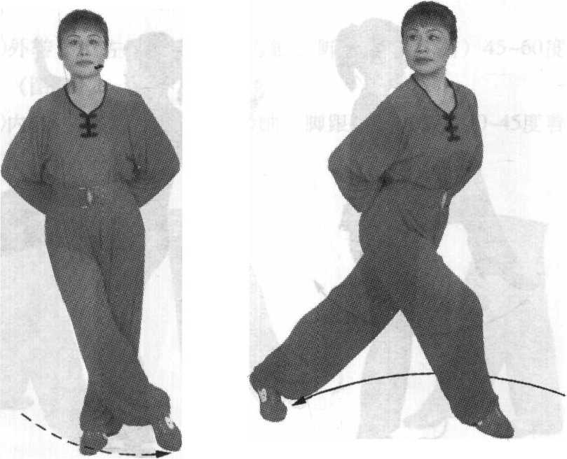 ① 外展:右脚向前 落步,脚跟着地,脚尖 外展30 ~90度落地。 (图 30)