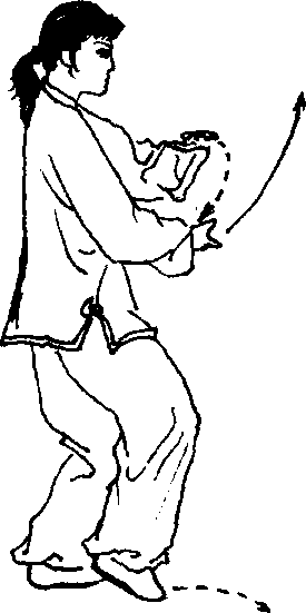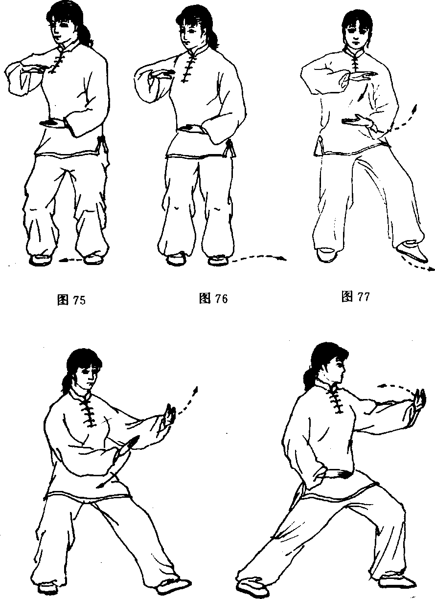 ①上体微向右转,身体重心移至右腿上;同时右臂收在胸前 平屈,手心向下,左手经体前向右下划弧放在右手下,手心向上, 两手心相对成抱球状;左脚随即收到右腿内侧,脚尖点地。眼看 右手(图75、76)。