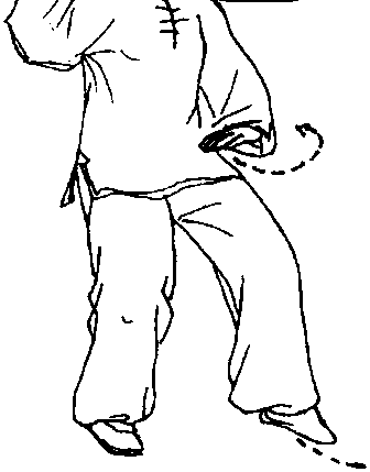 ?前足正对前进方向(东),后足是斜向。接下一个搂膝时; 先作转腰,外撇足尖,这样腿的位置就顺了。