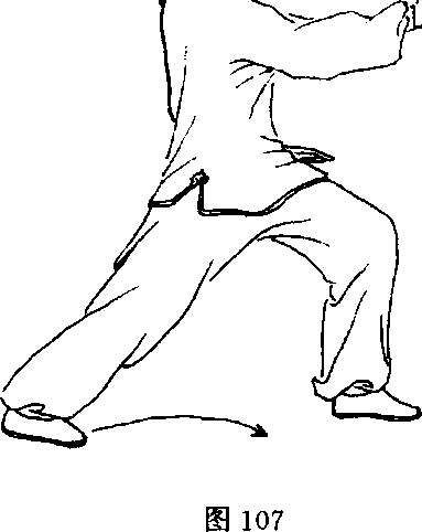 同时右手屈回经耳侧向前 推出,高与鼻尖平,左手向下由左膝前 搂过落于左胯旁,指尖向前。眼看右手 指(图 106、107)。