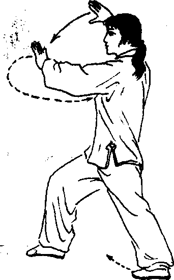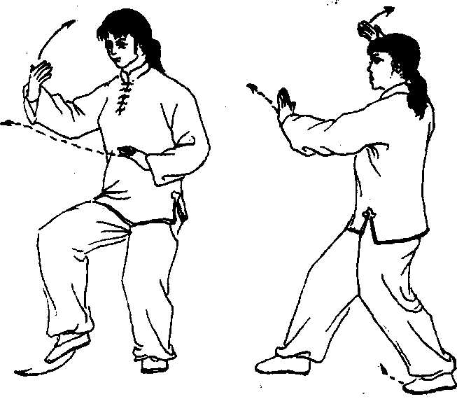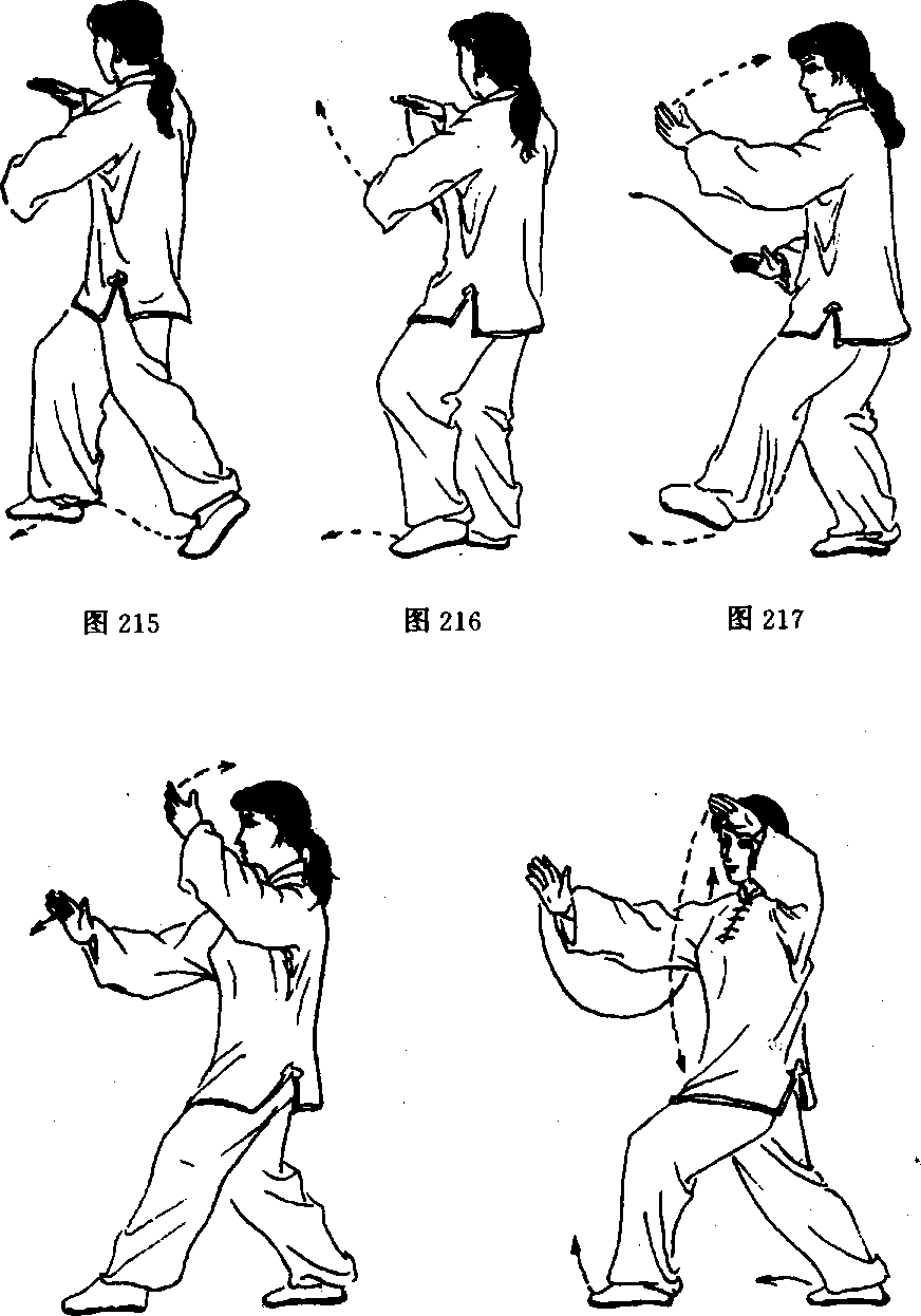 同 时两手在右胸前 成抱球状(右上 左下);眼看右前 臂(图215、