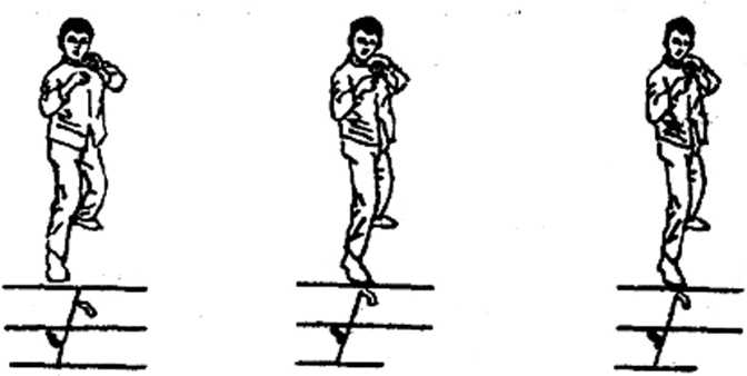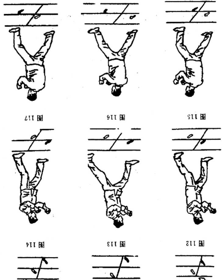 向后移动时,恰好是做相反方向的运动。后滑步的基本动 作与前滑步的一样,只是方向相反,如图121、122、123 (正 视),图 124、125、126 (侧视),图 127、128、129 (背视)所 示。后脚由戒备式向后滑动或移动大约半步,如图122所示。当 前脚后滑时,两脚间的距离只是髀间的加宽,一旦前脚定了位, 就应该立即恢复戒备式,并保持完好的平衡状态。与向前滑动 所不同的是:前脚向后滑动时,身体重心应稽移向后脚或支撑 脚。若要继续后退,重复以上过程即可。要学会脚步轻和后脚 跟抬起的本领。