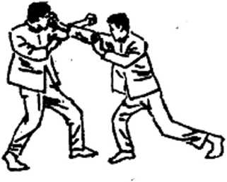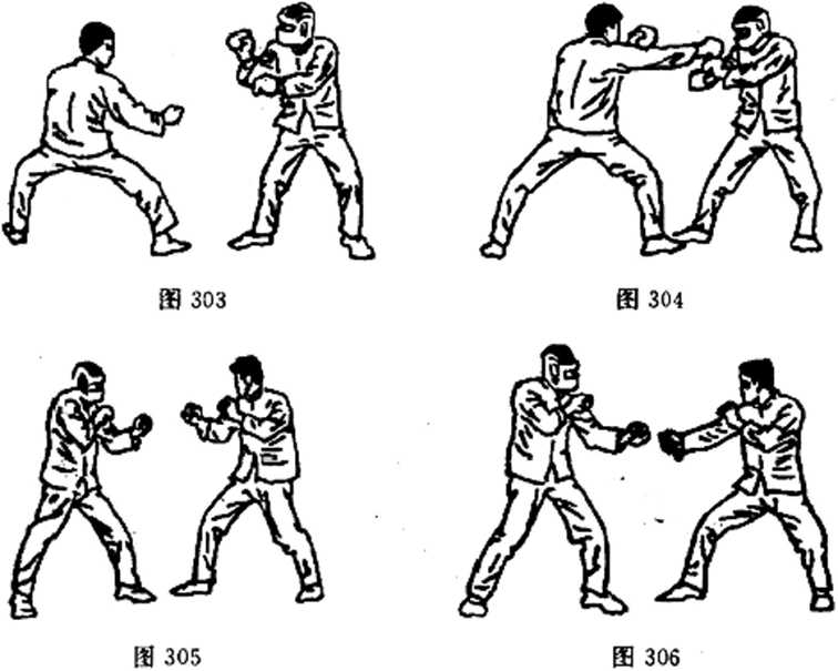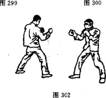 以指戳法攻击有经验的对手是很困雄的,在运用这一手法 之前,总是先做假动作。如图302,双方以戒备式对立。我稍微 下蹲,向前移动,似乎要攻击对手的身体中部,这就迫使对手 将防御之手(后手)向下移动,如图303c 一旦对手露出空档, 我迅速用手指戳击对手的眼睛,如图304。注意要用右脚抵住对 手的脚,以防对手起脚反击。