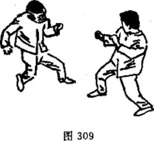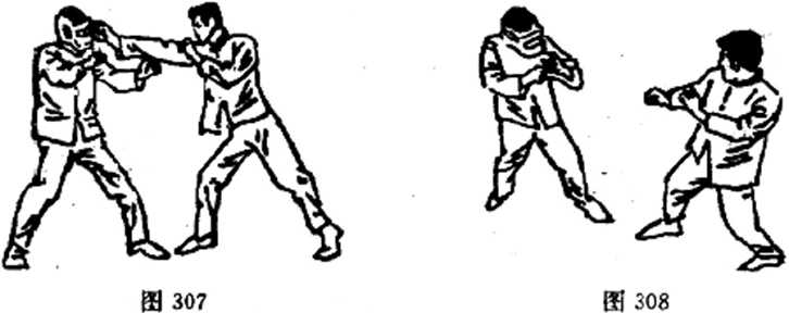 刻向对手的眼部猛戳,如图307。这种进攻,还能够从较远的距 离上完成攻击。脚的假动作也可破坏对手的镇定,除此之外,它 还可以防止对手起脚.