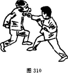 用戳击对付摆拳的攻击,也能收到很好的效果。如图308, 当对手摆拳打来时,我迅速地靠近对手,如图309,并以右手向 对手的面部斜戳,如图310。戳击的速度远比摆拳的速度快,而 117